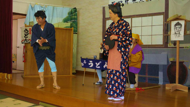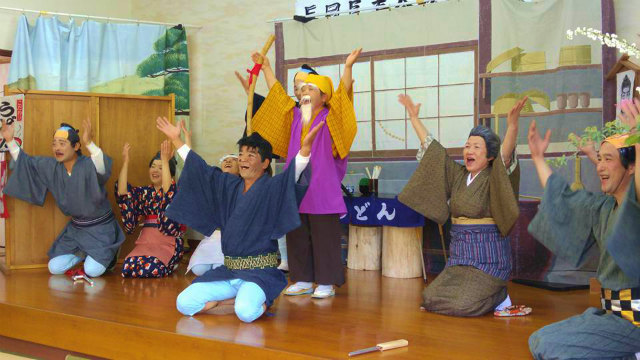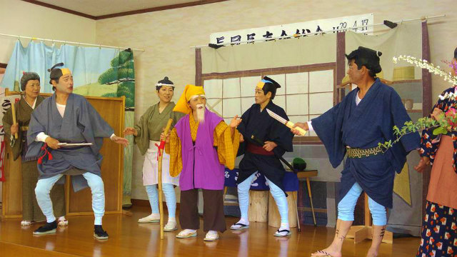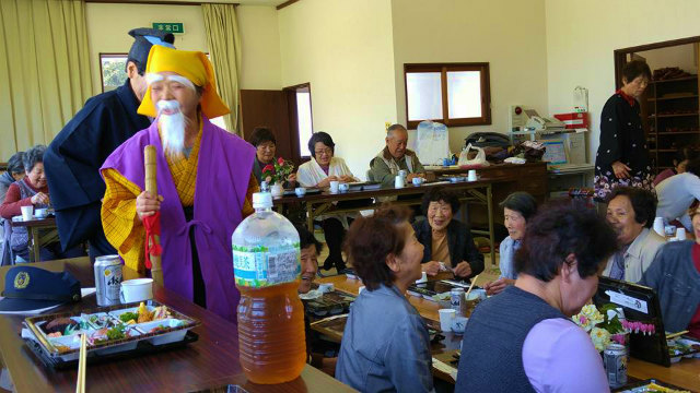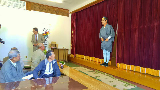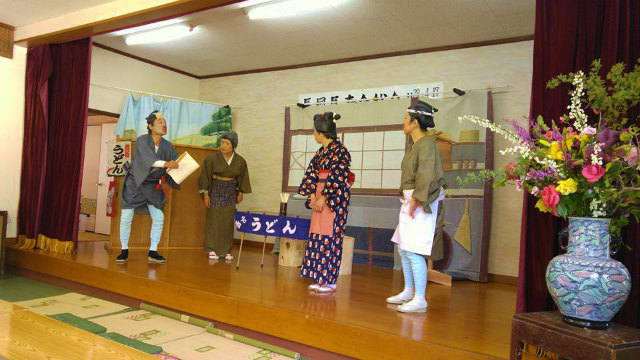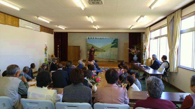 総会の後、恒例の懇親会です。本日の出し物は、哲多町の『なべやま一座』の公演です。楽しい踊りと演劇でした。
