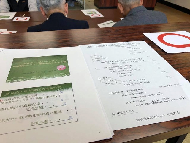 唐松・広瀬地区の73歳以上の251名中80数名の皆様がご出席でした。開会行事の後講演会。演題は「超高齢社会の中・健康で在宅介護」と「特殊詐欺防止・盗難対策」の2つ。唐松荘と新見警察署の皆様が講師を務められました。それから食事会。アトラクションは、「ザ・テンプルロック・ナイツ」と「唐松子供神楽保存会」の皆様。