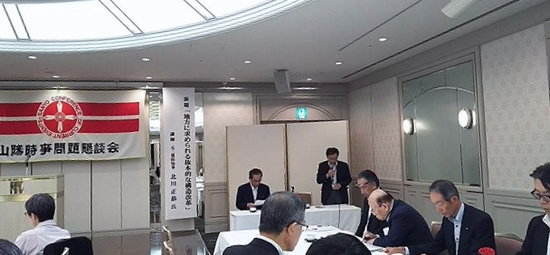 17時30分から、岡山市内のホテルで開催された『山陽時事問題懇談会』に出席しました。多くの皆様がご出席でした。司会は、尊敬する岡山一郎氏。太田真庭市長もご出席でした。