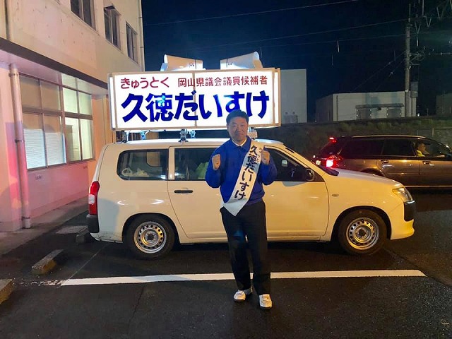 それから高梁市へ移動して、岡山県議会議員選挙に自由民主党公認候補として立候補している久徳だいすけ氏の事務所を激励訪問しました。ほどなく選挙カーが戻ってきました。