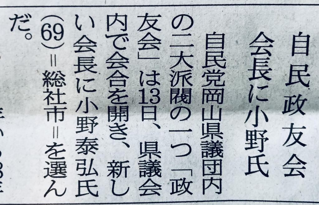 おはようございます。昨日午後開催された「政友会(天野学会長)」で、引退される天野学会長の後任会長に、小野泰弘県議が就任することが決まった。記事は、今朝の山陽新聞です。