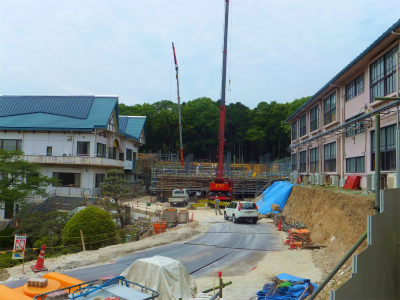 午前中学校法人用務。新見公立大学新校舎工事現場と金谷
