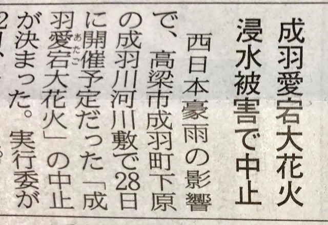 今朝の山陽新聞が、「成羽愛宕大花火」の中止を報じている。残念だが致し方がない。