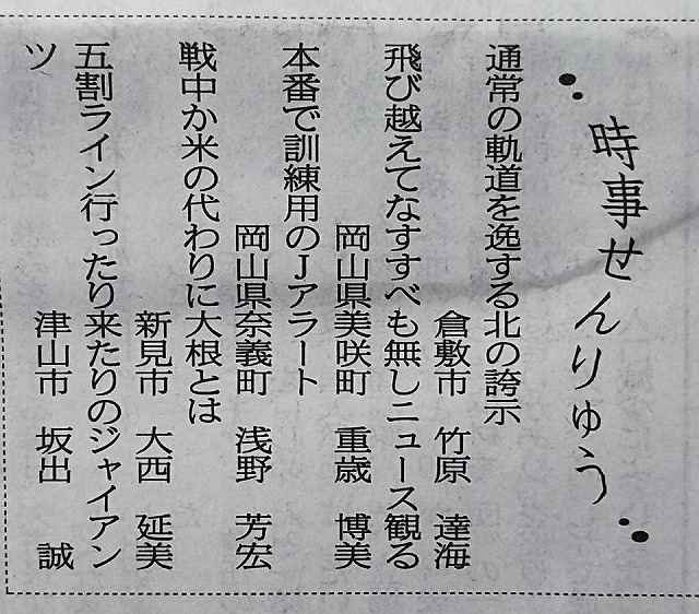 同級生大西延美さん、おめでとうございます。山陽新聞「時事せんりゅう」です。この話題かな。シャリに大根使う米なし寿司。
