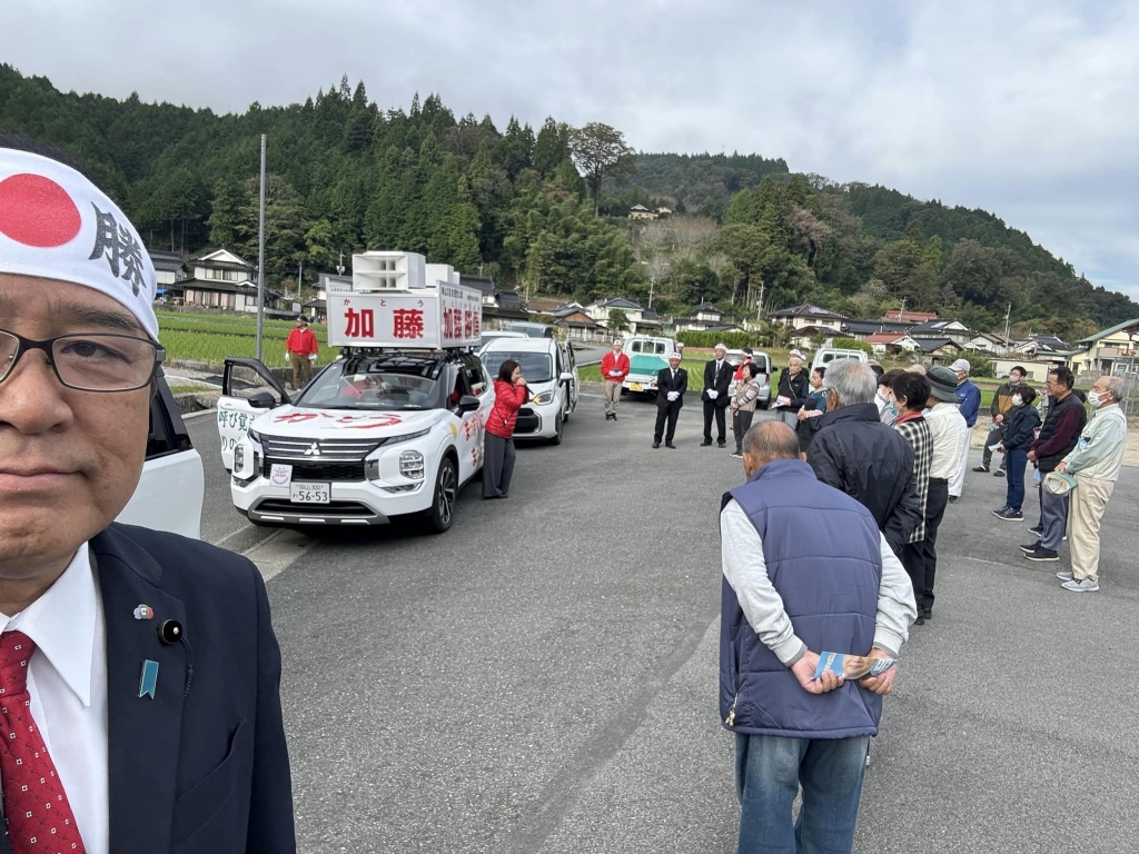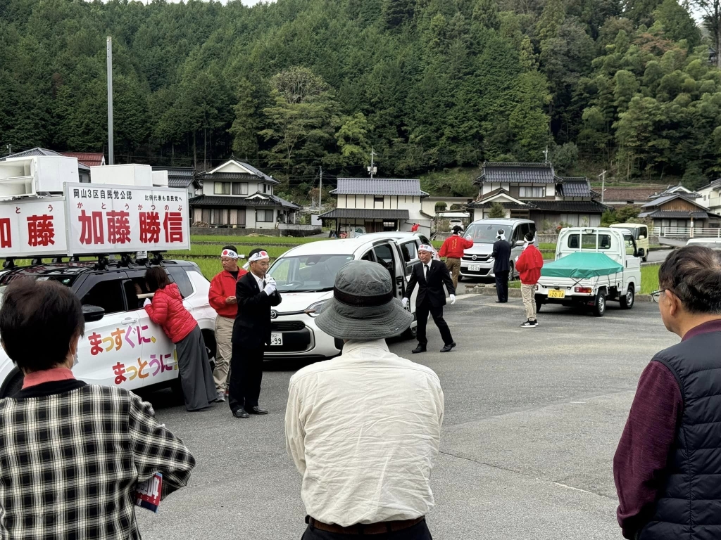 7時20分から、「朝の辻立ち」。8時から、「加藤勝信選挙カー」。新見地区最後の遊説です。ありがとうございます。寝ても覚めても加藤勝信、加藤勝信!ありがとうございます。よろしくお願いします。