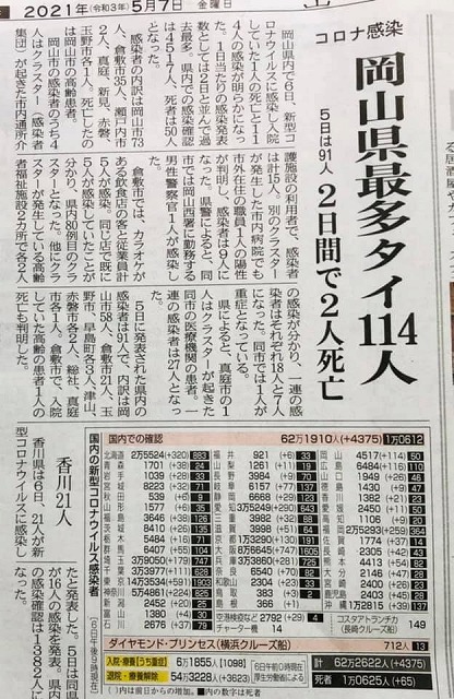おはようございます。「岡山県最多タイ114人」の文字が目に飛び込んでくる。地域と共にの山陽新聞です。