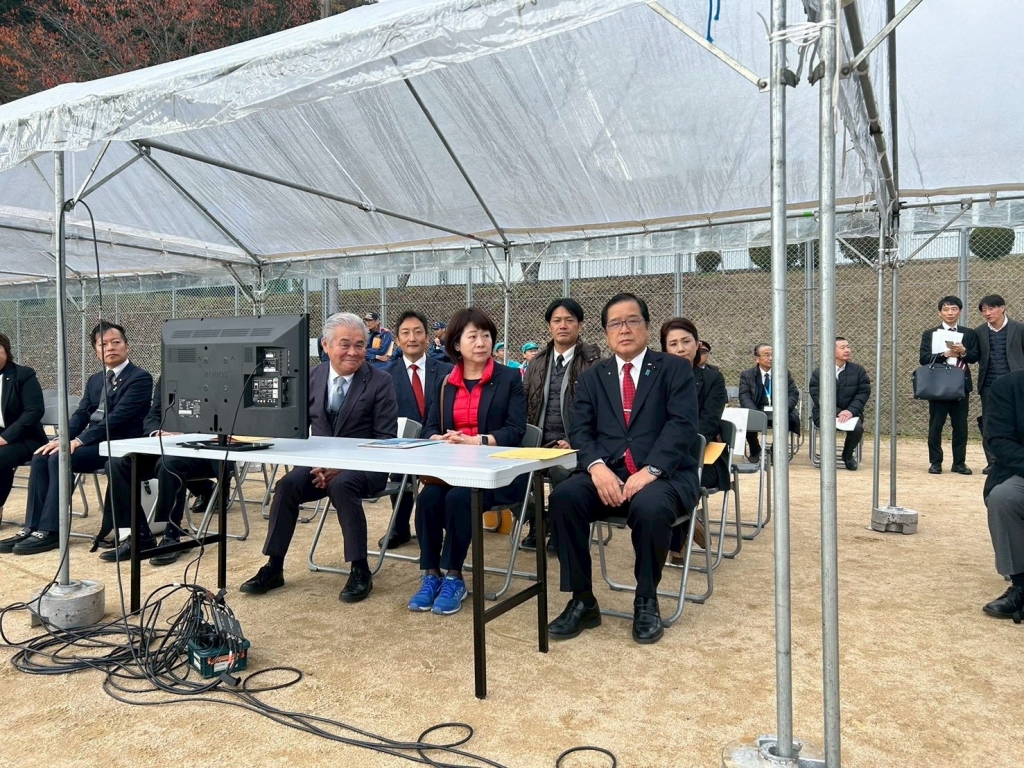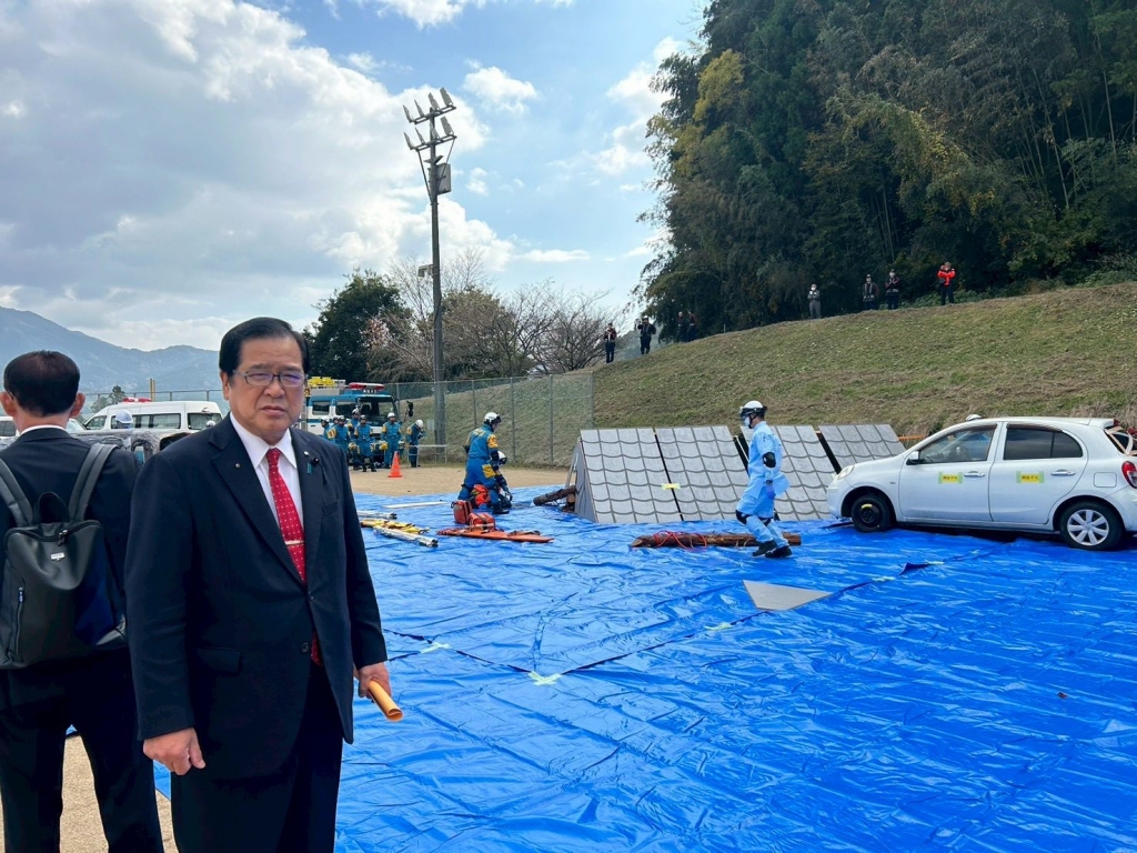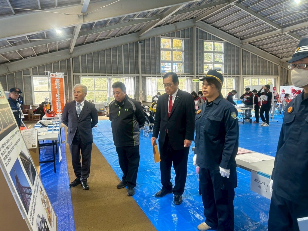10時から、「津山市加茂町スポーツセンター」及び「津山市阿波グラウンド」で開催された『令和7年度岡山県・津山市総合防災訓練』に出席しました。訓練の目的は、「断層型地震の発生による被害を想定し、県・市町村と防災関係機関等が一体となった実践的な連携訓練を実施することにより、総合的な災害対応力の向上及び県民の防災意識の高揚を図る」ことです。