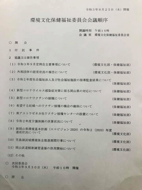 8時40分から「委員長レク」。9時40分から「自民党県議団総会」。10時から「環境文化保健福祉委員会」開会。委員会では委員の皆様から多くのご発言を頂きました。ありがとうございました。それから協議等々。