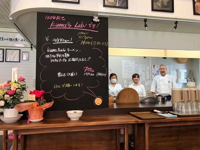 明日20日㈰、御殿町センター1階にオープンする「クマさんラボ」。当面はラーメンのみの販売で、営業時間は11時30分から14時です。夜は予約制になるそうです。ラーメン750円、替え玉150円也。