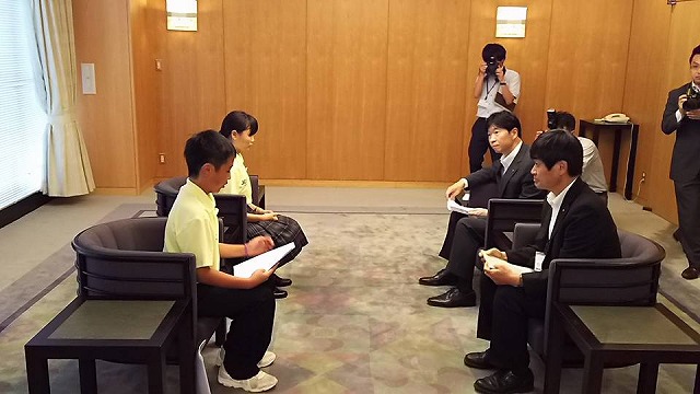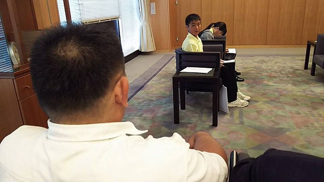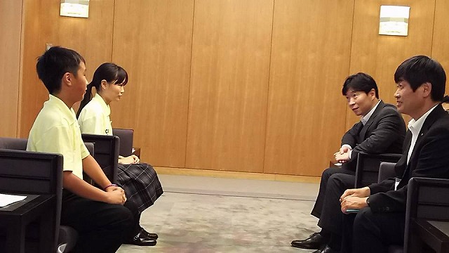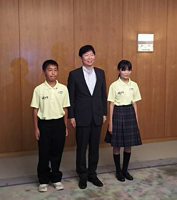 この『県知事報告会』は、岡山県から日本青年会議所少年少女国連大使事業に参加した新見青年会議所推薦の佐久本くんと備前青年会議所推薦の林さんが、伊原木知事にその成果を報告したものです。