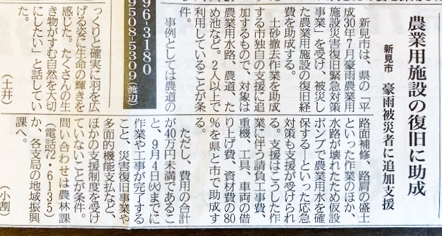 新見市は、岡山県の「平成30年7月豪雨農業用施設災害復旧緊急対策事業」を受けて、県と市で80%助成すると発表しました。