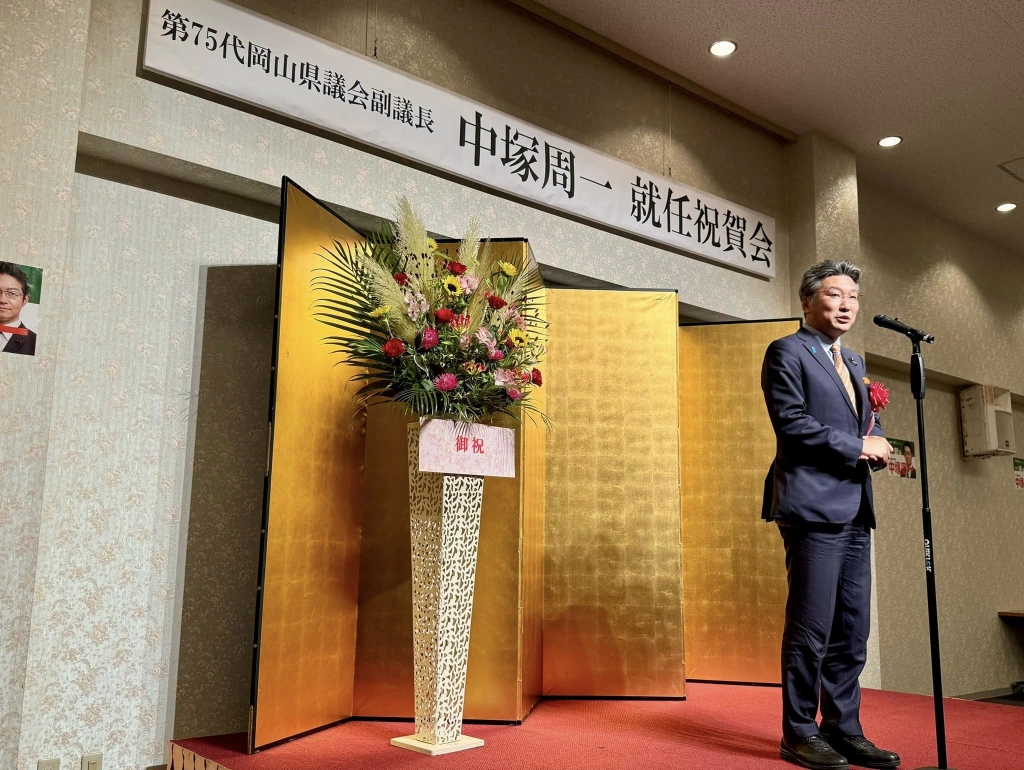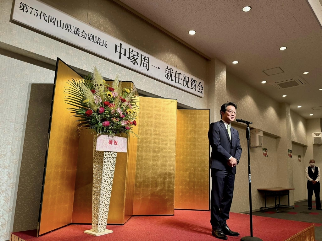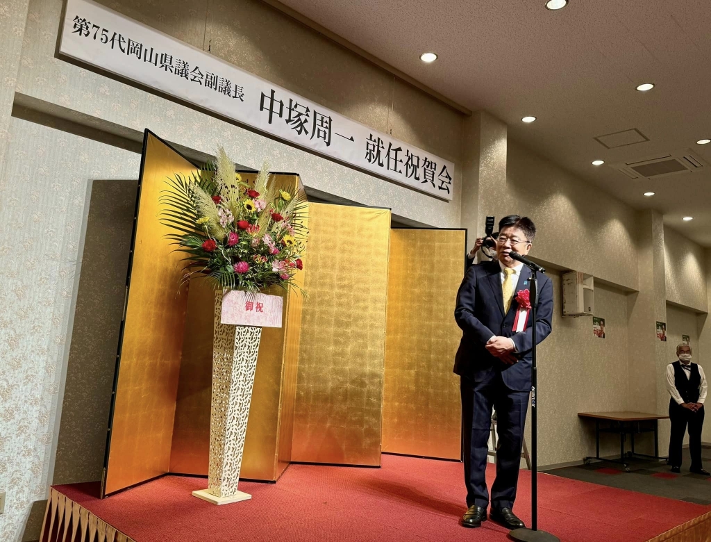 倉敷市内のホテルで開催された「第75代岡山県議会副議長中塚周一就任祝賀会」に出席しました。おめでとうございました。