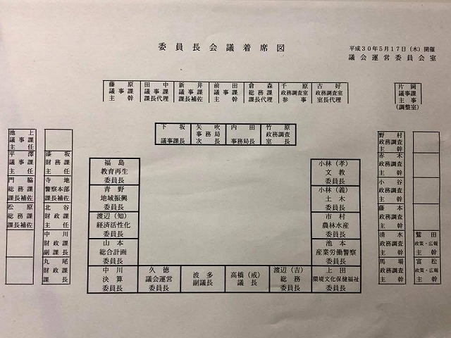 10時から、「議会運営委員会室」で開催された『委員長会議』に、5年連続で出席させて頂きました。努めさせて頂きましたのは、次の通りであります。