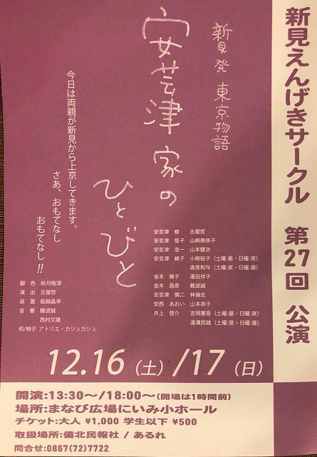 「新見えんげきサークル」の第27回公演が、12月16日㈯と17日㈰の両日、「まなび広場にいみ」で行われる。いずれも昼夜2回公演。かなりの完成度らしい。幸せの予感がするよ~♫お出かけ下さい。