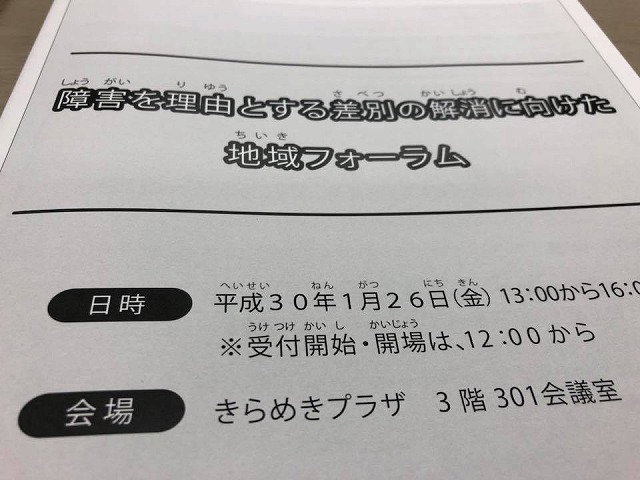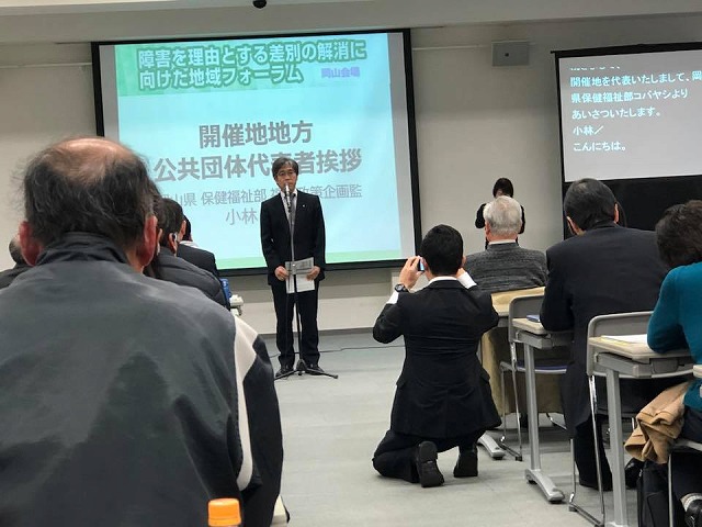13時から「きらめきプラザ3階301会議室」で開催された、『障害を理由とする差別の解消に向けた地域フォーラム(岡山会場)』に出席しました。主催は、内閣府と岡山県です。