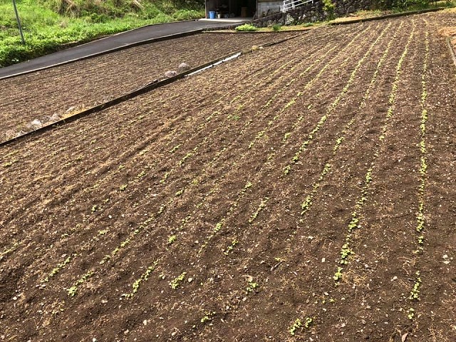 耕すだけだった畑。初めて作付けした蕎麦(ソバ)が芽吹いた。