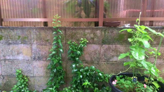 雨が少し心配な朝となりました。我が家の4時ごろから降り始めました。さて、お久し振りの「我が家のツタ」くん、迷いなく!伸びています。