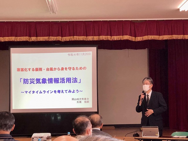 13時30分から、「唐松市民センター」で開催された「唐松地区防災講習会」に、地域の一員として参加しました。講師は、岡山地方気象台の矢尾信嗣氏。テーマは、「防災気象情報活用~マイタイムラインを考えてみよう~」でした。