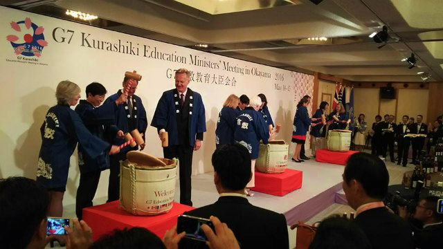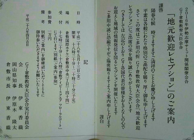 18時30分から、倉敷市内のホテルで開催された『地元歓迎レセプション』に出席しました。このレセプションは、14、15の両日倉敷市で開催される『伊勢志摩サミット関係閣僚会合~G7倉敷教育大臣会合~』に先立って開催されたもの。ホスト役の伊東倉敷市長、伊原木岡山県知事の堂々とした立ち振る舞いが素敵でした。また、ケネディ米国駐日大使と握手をさせていただく機会があり、うれしく思いました。チャーミングな方でした。