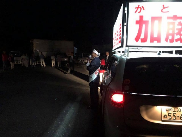 新見へ帰って、夕方から北房選対から受け継いだ「加藤勝信選挙カー」と共に、新見市内を走りました。すっかり日が暮れて高梁選対にバトンタッチ。皆様、お疲れ様でした。ありがとうございました。
