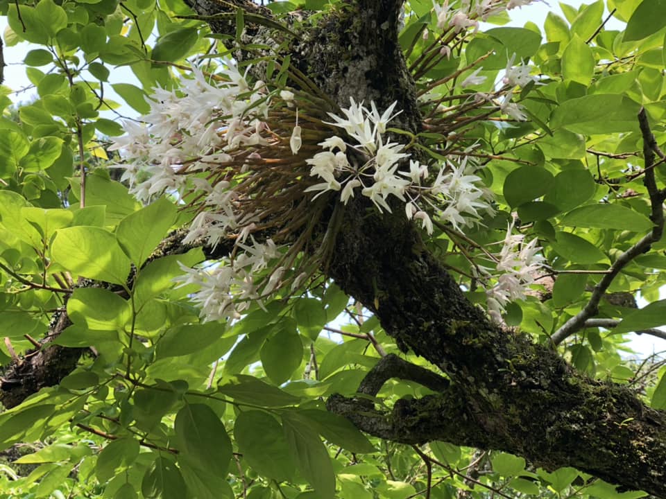 曇り空です。柿木の上で、セッコクが咲いている。本日もよろしくお願いします。頑張りましょう。