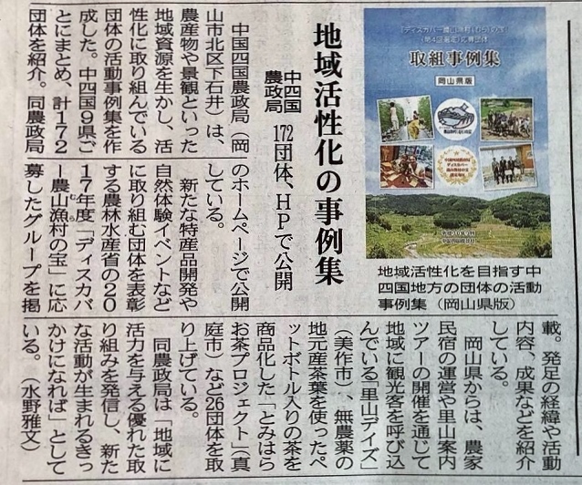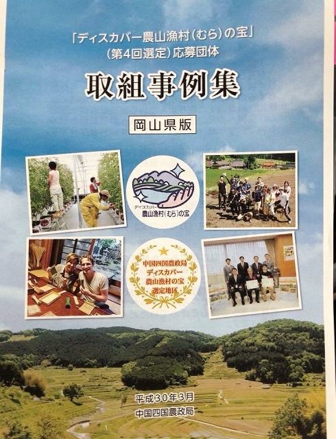 先日新聞報道された「中四国農政局」の『「ディスカバリー農山漁村(むら)の宝」(第4回選定)応募団体取組事例集』の内、「岡山県版」を、県の方が届けて下さった。ありがとうございました。