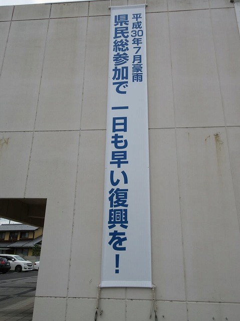 備中県民局に『平成30年7月豪雨 県民総参加で一日も早い復興を!』の懸垂幕が掲げられた。素晴らしいと思う。