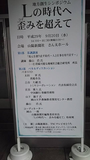 14時15分頃『9月岡山県議会定例会』が散会。急いで「山陽新聞社さん太ホール」へ移動して、14時から開催されている『地方創生シンポジウム~Lの時代へ歪みを超えて~』に、遅れて出席しました。