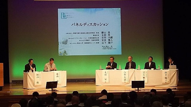 続いて、「パネルディスカッション」が行われました。パネリストは、真庭市長太田昇氏、トミヤコーポレーション会長古市大蔵氏、中国銀行頭取宮長雅人氏、岡山大学教師教育開発センター教授山下陽子氏、そして本日の講師の藤山浩氏でした。コーディネーターは、山陽新聞社編集委員室長岡山一郎氏。