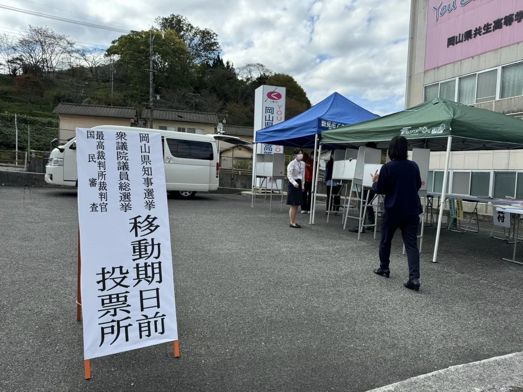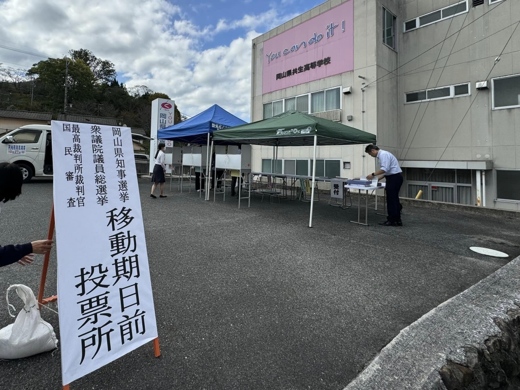 岡山県共生高等学校です。移動期日前投票所が開設されています。若者よ、投票しよう\(^o^)/