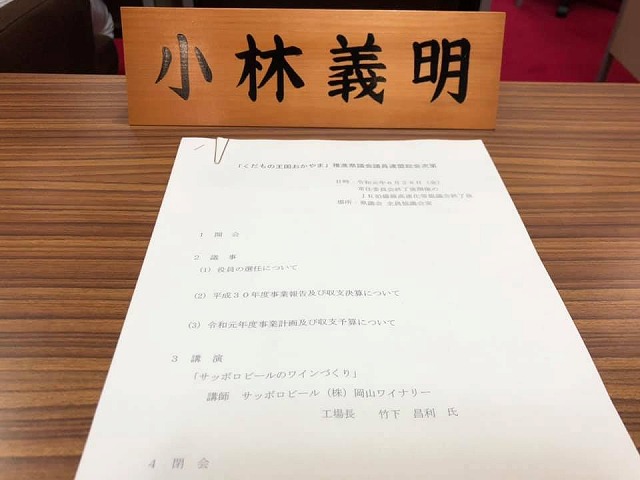 続いて、『「くだもの王国おかやま」推進県議会議員連盟(内山登会長)総会』に出席しました。総会行事の後、「サッポロビールのワインづくり」と題してサッポロビール(株)岡山ワイナリー工場長、竹下昌利氏が講演されました。