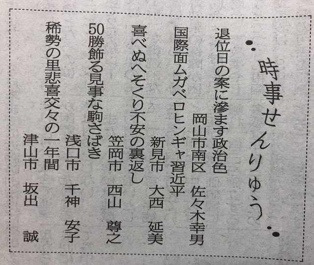 今朝の山陽新聞「時事せんりゅう」、同級生大西延美さん、掲載おめでとうございます。素晴らしい。
