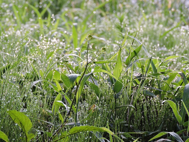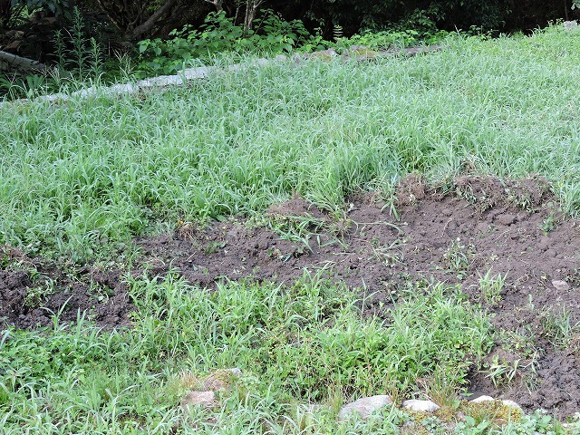 「朝のお散歩」、イノシシがあちこちで掘り返していた。いつもの事と驚かなくなった小林ふくであります。朝露が美しい。
