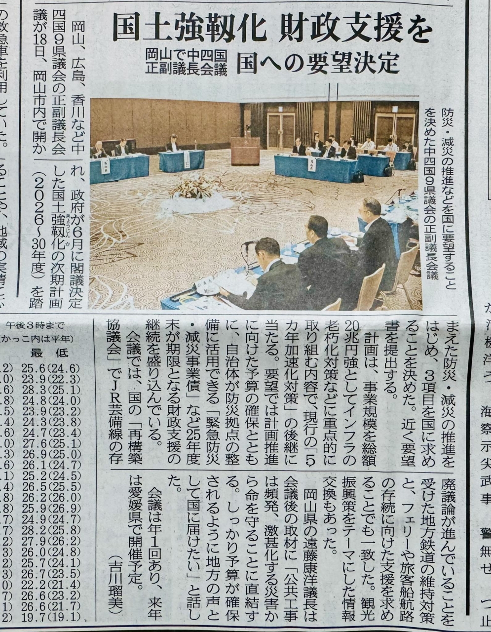 昨日の山陽新聞です。「中国四国九県議会正副議長会議」の模様を伝えていました。