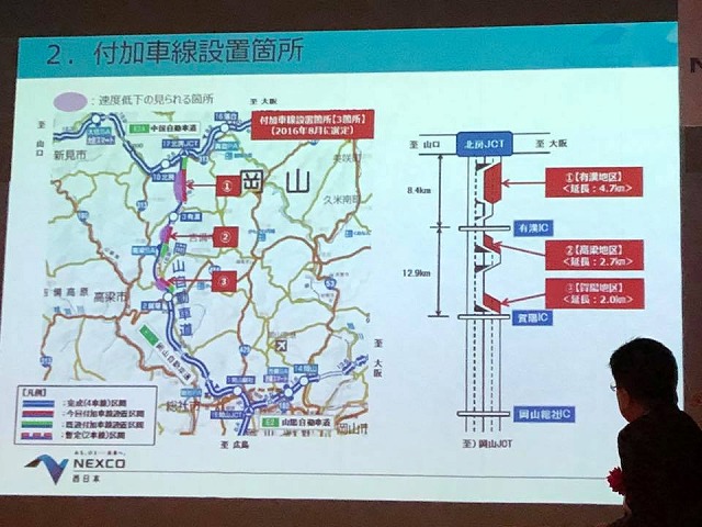 平成28年6月7日に付加車線設置検証路線として「岡山米子道(賀陽IC~北房JCT)、蒜山IC~米子IC)が選定されたことから、暫定2車線区間の走行性、安全性の確保を目指し、岡山道、米子道において付加車線を設置し、効果を検証する。