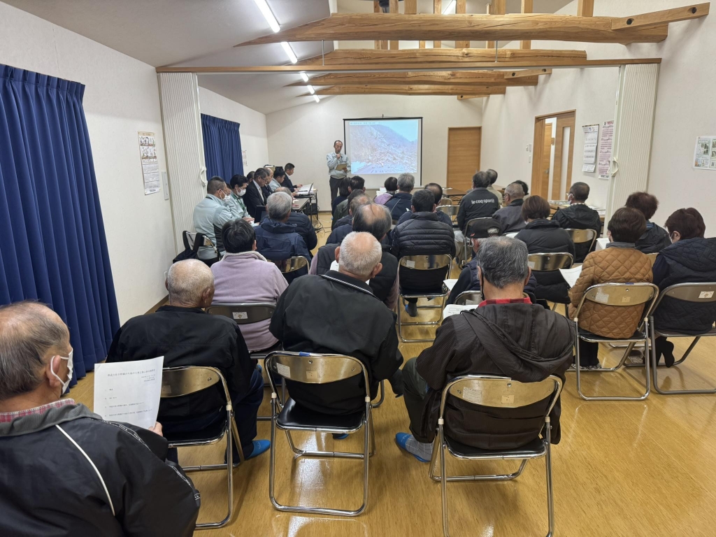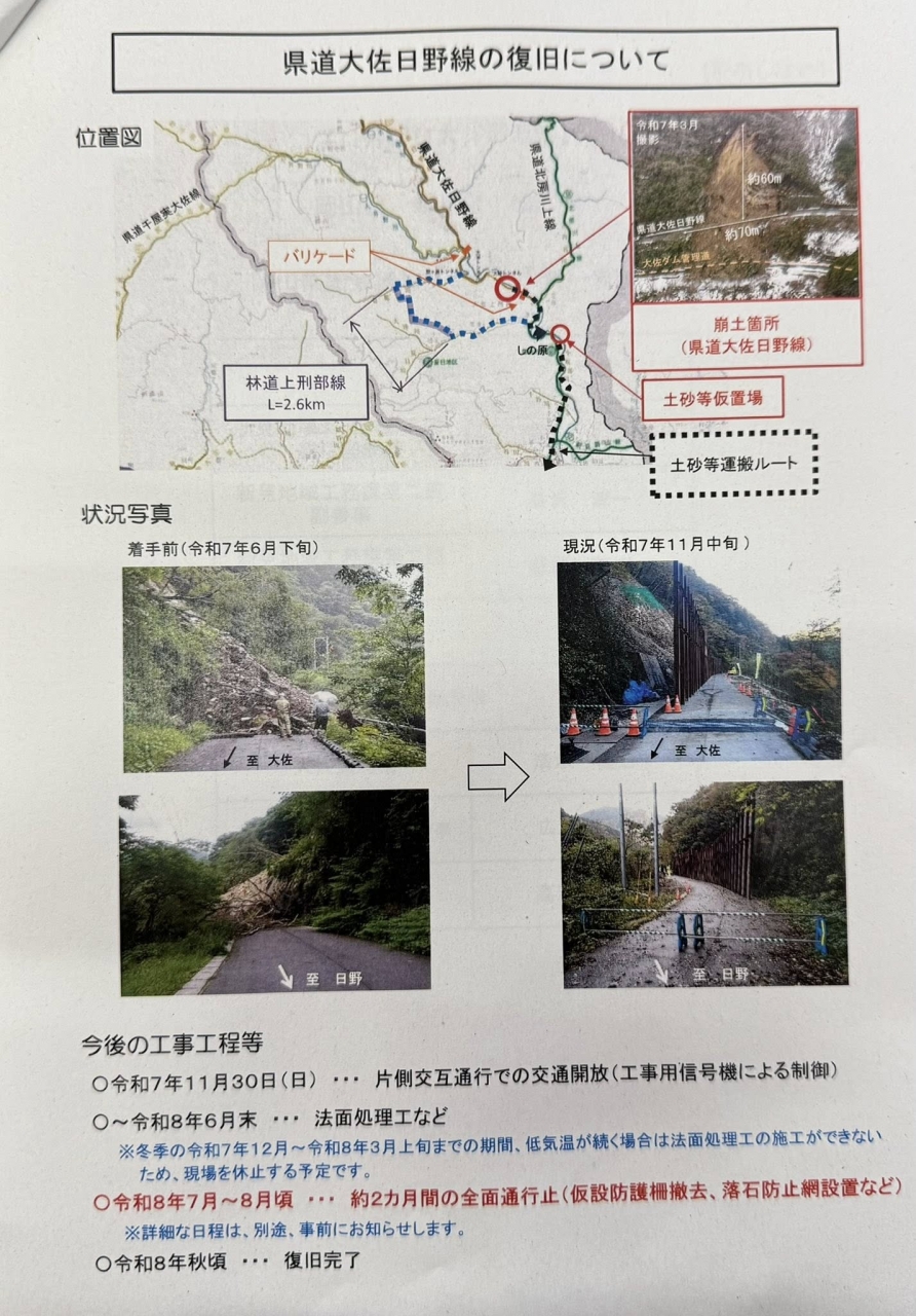 19時から、「大佐公民館大井野分館」で開催された『県道大佐日野線の今後の工事工程に係る説明会』に出席しました。ご挨拶の機会を頂きましたので、第一に地域の皆様のご理解とご協力に感謝を申し上げました。次に、迅速な復旧工事を担ってくださった工事関係の皆様、県・市の担当の皆様にお礼を申し上げました。「11月30日から片側交互通行が出来ます」と報告された時、拍手が起きました。迂回道は遠く十分な整備がされていない山道で、雪深い地域ですから。もうすぐ雪が降り始めます。