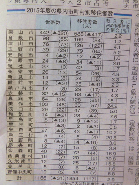 今日の朝刊から。「岡山県内への移住者1854人」の記事。新見市のお隣さん比較、真庭市128人、高梁市54人。ちなみに新見市24人。