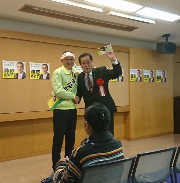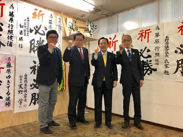 続いて、玉野市選挙区から無所属・公明党推薦候補として立候補している藤原ゆきてる候補の個人演説会2会場で応援弁士を務めました。頑張りましょう。藤原ゆきてる選挙事務所で、応援に入られた石井参議院議員とお会いしました。