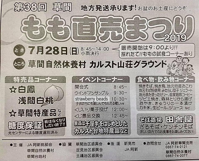 『第38回草間もも直売まつり2019』のご案内です。お出かけください。新見市草間の桃は、うまいで~ぇ!