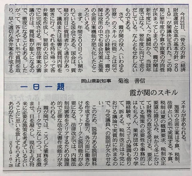 6時10分に新見を出発して、先ほど県議会棟に入りました。所用で岡山県護国神社を参拝。それから県議会棟へ。9時10分から、「自民党県議団常任総務会」、9時40分から「自民党県議団総会」、10時から「岡山県議会6月定例会(閉会日)」です。新聞記事は、山陽新聞夕刊です。