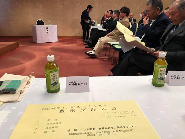 10時から「JA阿新Aコープ」で開催された『平成29年度JA阿新ぶどう部会豊永支部大会』に出席しました。開会行事で、一言ご挨拶の機会を頂きました。ありがとうございました。平成30年の増収増益に向けて頑張りましょう。