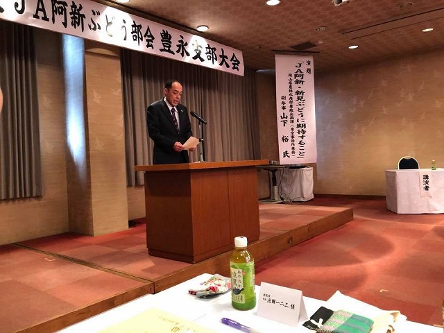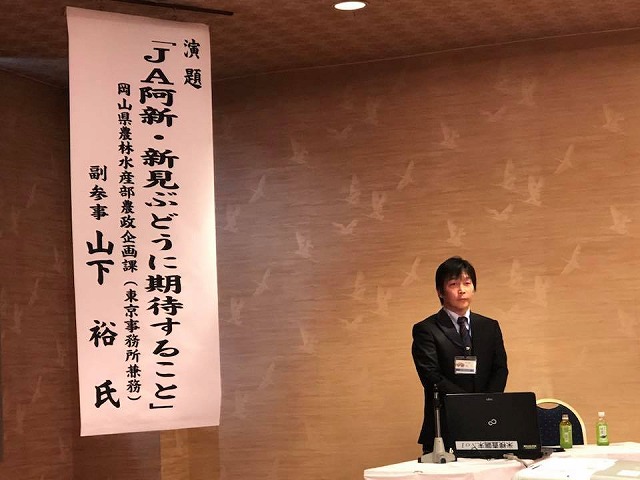 講演。講師は岡山県農林水産部農政企画課(東京事務所兼務)副参事山下裕氏。テーマは「JA阿新・新見ぶどうに期待すること」。