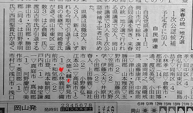 今日の山陽新聞朝刊です。昨日2日㈯に開催された「自民党岡山県連総務・選対会議」において、来春の統一地方選挙で行われる県議会議員選挙の第一次公認候補予定者に決めて頂きました。