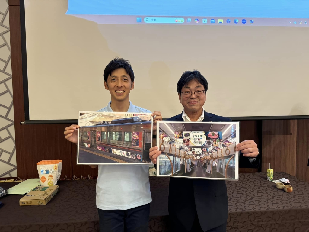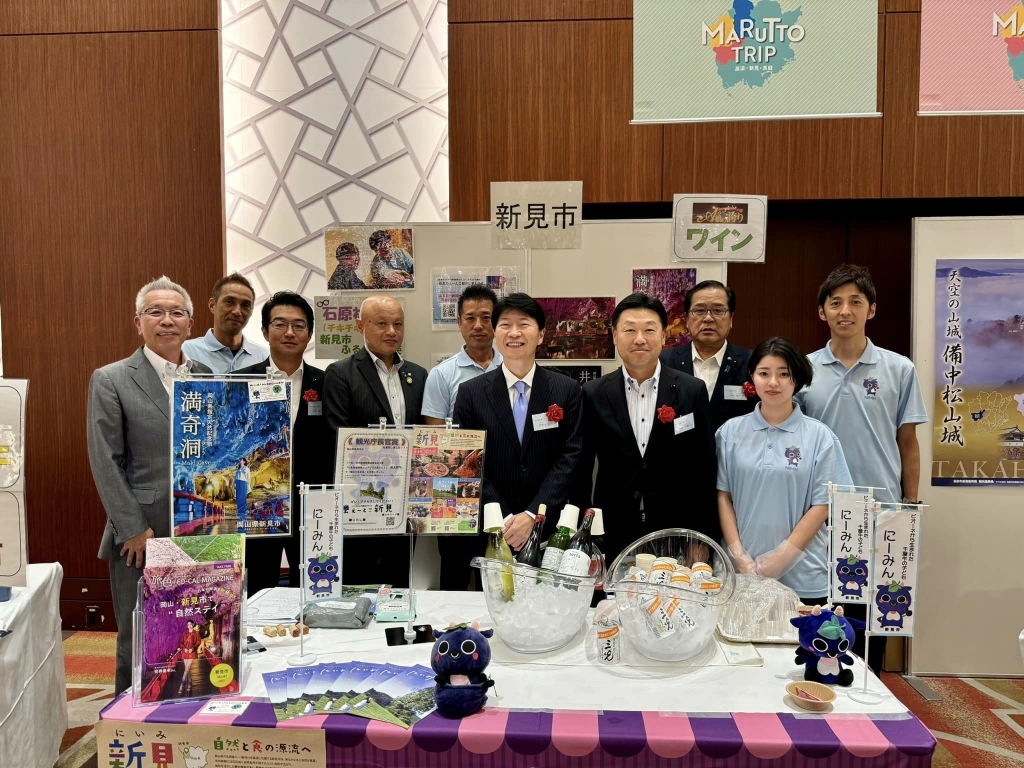 今日の『「近畿おかやま会」令和7年度総会・第68回岡山県人の集い』で、伊原木知事、久徳県議会議長、中塚県議会副議長、加藤県議が揃って、新見市のブースに来て下さいました。激励ありがとうございました。新見市の職員の皆様、今年もありがとうございました。おお、ステージでは、根石副市長の熱い新見市PR!