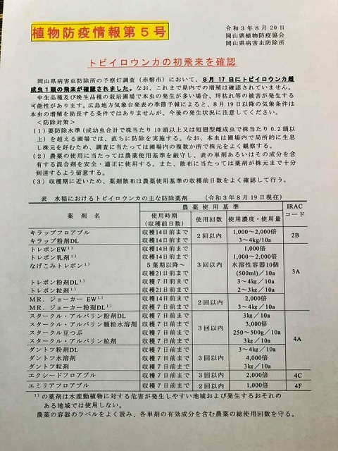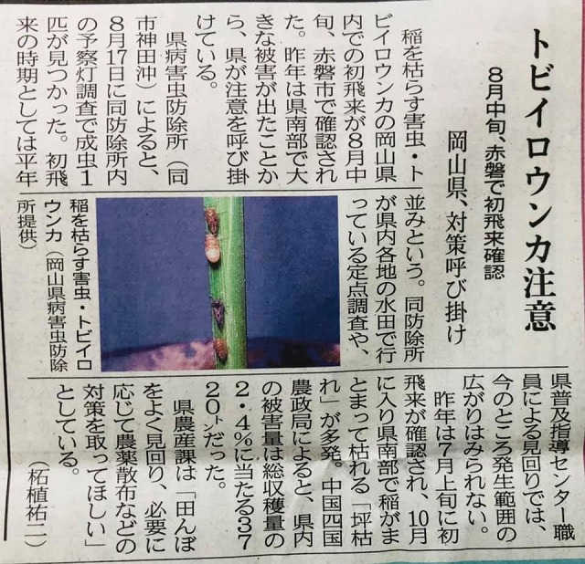 山陽新聞が、トビイロウンカの初飛来確認と県が注意を呼びかけていることを伝えている。ありがたい。