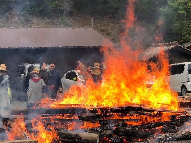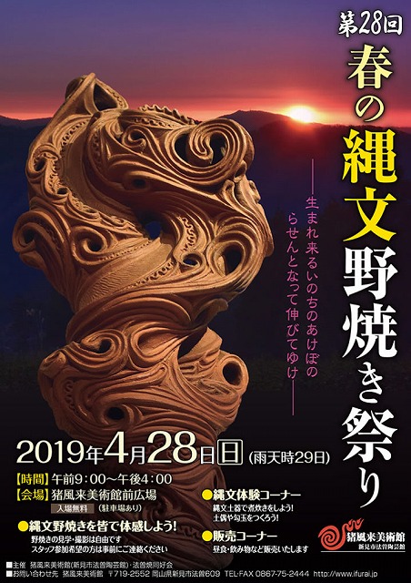 9時から、「猪風来美術館前広場」で開催された『第28回春の縄文野焼き祭り』に、遅れて出席しました。年2回春秋の開催ですから、来年は15周年記念開催となります。おめでとうございます。遅参したにもかかわらずご挨拶の機会を作って頂きました。ありがとうございます。