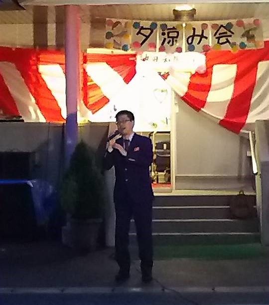 18時30分から「グループホーム花みずき駐車場」で開催された『グループホーム花みずき、花すすき夕涼み会』に出席しました。一言ご挨拶の機会を頂きました。ありがとうございました。雨も上がって、利用者とご家族、地域の皆様、施設の皆様が一体となっての和やかな夕涼み会となりました。