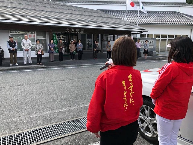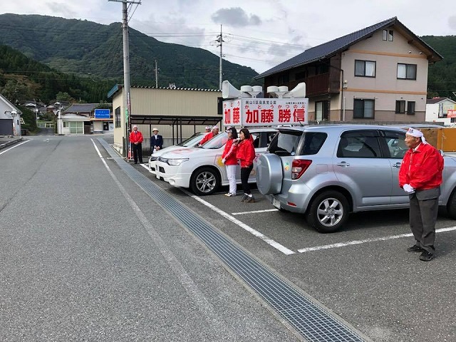 「船川八幡宮」へ参拝した後、大佐町へ移動して、加藤勝信選挙カーを迎えての応援演説。今日は紗希ちゃんが同乗して頑張っておられました。頑張れ、頑張れ。