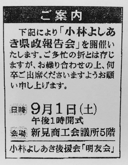 9月1日㈯13時から「新見商工会議所5階」で『小林よしあき県政報告会』を開催していただきます。新見市街から加藤勝信厚生労働大臣、石井正弘参議院議員、小野田紀美参議院議員にご出席いただく予定です。9月20日投開票の自由民主党総裁選挙、来年7月に実施されるであろう第25回参議院議員通常選挙、そして私どもの来年4月実施予定の岡山県議会議員選挙等のお話が聞けるのではないかと思います。新見市の多くの皆様のご出席をお待ちしております。会費はありません。よろしくお願いします。
