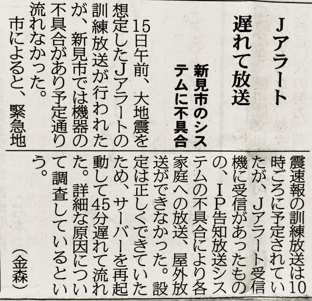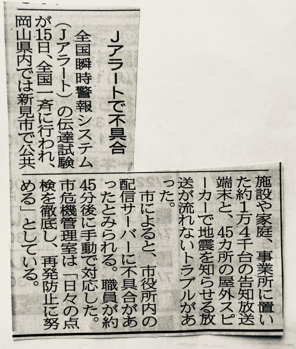 全国Jアラート伝達試験(訓練)で発見できてよかったと考えたい。県下でその他の不具合はなかったと聞いた。